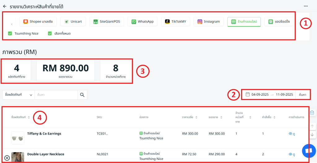 ขั้นตอนที่ 2: กรอง ช่องทางการขาย และ ร้านค้า จากนั้นค้นหา ช่วงวันที่ เพื่อวิเคราะห์รายงาน