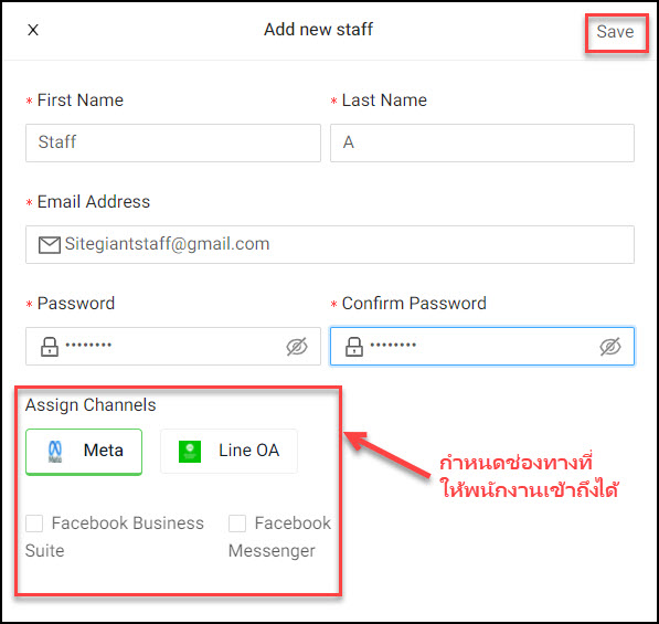 ขั้นตอนที่ 3: กรอกรายละเอียดของพนักงานใหม่ > กำหนดช่องทางที่พนักงานสามารถเข้าถึงได้ > บันทึก