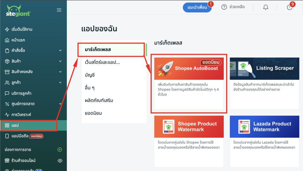 ขั้นตอนที่ 1: ไปที่ แอป บนแถบด้านข้าง > มาร์เก็ตเพลส > Shopee AutoBoost