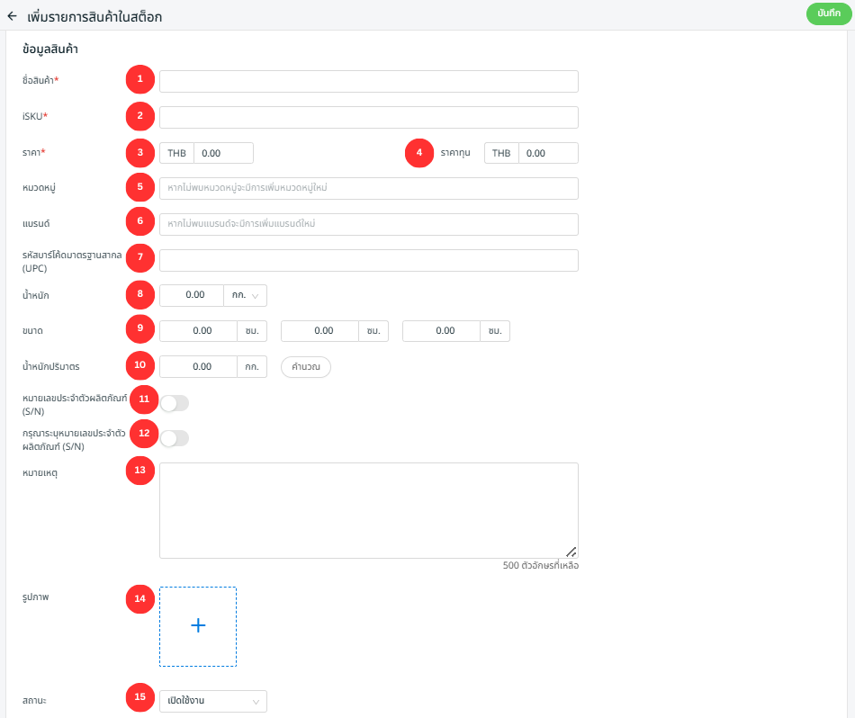 📌หมายเหตุ: ข้อมูลสินค้าที่มีเครื่องหมาย * จำเป็นต้องกรอก 1. ชื่อสินค้า*: ชื่อของสินค้า หรือรายการสินค้าที่ต้องการบันทึกในระบบ 2. รหัสสินค้าในคลัง (iSKU)*: รหัสประจำสินค้าคงคลังที่ใช้สำหรับระบุสินค้าเฉพาะรายการ (เป็นรหัสเฉพาะที่ไม่ซ้ำกัน) 3. ราคา*: ราคาขายของสินค้า 4. ราคาทุน*: ราคาต้นทุนหรือราคาที่ใช้ในการจัดซื้อสินค้ารายการนั้น 5. หมวดหมู่: หมวดหมู่หรือประเภทของรายการสินค้า 6. แบรนด์: แบรนด์หรือยี่ห้อของสินค้า 7. รหัส UPC (Universal Product Code): รหัสสินค้าสากลที่ใช้สำหรับการสแกนบาร์โค้ด 8. น้ำหนัก: น้ำหนักจริงของสินค้า 9. ขนาด: ความยาว ความกว้าง และความสูงของสินค้า 10. น้ำหนักตามปริมาตร: น้ำหนักที่ใช้สำหรับคำนวณค่าจัดส่ง โดยพิจารณาจากขนาดของสินค้า สามารถคลิกที่ปุ่ม คำนวณ (Calculate) เพื่อให้ระบบคำนวณน้ำหนักตามปริมาตรโดยอัตโนมัติจากข้อมูลขนาดของสินค้า 11. หมายเลขประจำตัวผลิตภัณฑ์ (S/N): รหัสเฉพาะที่กำหนดให้กับสินค้าทุกรายการ ดูเพิ่มเติมที่หัวข้อ วิธีเปิดใช้งานการติดตามหมายเลขประจำตัวผลิตภัณฑ์ (S/N) สำหรับรายการสินค้าในสินค้าคงคลัง (มีให้เฉพาะในแพ็คเกจ ERP Premium ขึ้นไปเท่านั้น) 12. ต้องระบุหมายเลขประจำตัวผลิตภัณฑ์ (S/N): รหัสประจำตัวเฉพาะที่กำหนดให้กับสินค้าแต่ละชิ้น เรียนรู้เพิ่มเติมเกี่ยวกับการเปิดใช้งานระบบติดตามหมายเลขซีเรียลสำหรับรายการสินค้าได้ที่หัวข้อ วิธีเพิ่มหมายเลขประจำตัวผลิตภัณฑ์ (S/N) และพิมพ์ในใบแจ้งหนี้ (ฟีเจอร์นี้ใช้ได้เฉพาะแผน ERP Premium ขึ้นไป) 13. หมายเหตุ: ข้อมูลเพิ่มเติม หรือคำอธิบายเพิ่มเติมเกี่ยวกับรายการสินค้า 14. รูปภาพ: อัปโหลดภาพสินค้า ประเภทไฟล์ JPG หรือ PNG ขนาดภาพแนะนำคือ 800 x 800 พิกเซล และขนาดไฟล์ไม่เกิน 300KB 15. สถานะ: ใช้สำหรับเปลี่ยนสถานะของสินค้าที่เลิกจำหน่ายเป็น “ไม่ใช้งาน” (Inactive) หลังจากเปลี่ยนสถานะสินค้า รายการสินค้านั้นจะไม่ปรากฏในรายชื่อสินค้าคงคลังแบบไลฟ์ (Live Inventory Item Listing) อีกต่อไป นอกจากนี้ เมื่อมีการอัปเดตสถานะสินค้า (Item Status) หรือสถานะสต็อก (Stock Status) สำหรับสินค้าที่เชื่อมโยงกับชุดสินค้า (Kit) ระบบจะแสดงแจ้งเตือน “ตรวจพบชุดสินค้าสำหรับรายการนี้ (Kit detected for this item)” เพื่อแจ้งให้ผู้ขายทราบว่า อาจจำเป็นต้องเปลี่ยนสถานะของชุดสินค้านั้นแยกต่างหาก เพื่อให้มีผลเหมือนกันทั้งชุดสินค้า