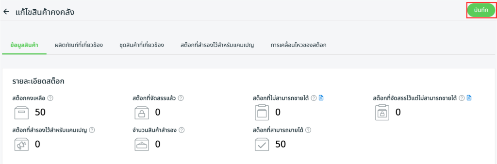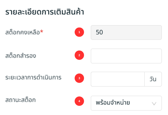 1. สต็อกคงเหลือ: จำนวนสินค้าทั้งหมดที่คุณมีอยู่ในขณะนี้ภายในคลังสินค้า (หรือหลายคลังหากมีมากกว่าหนึ่ง) 2. สต็อกสำรอง: ระดับสต็อกขั้นต่ำที่กำหนดไว้สำหรับสินค้านี้ เมื่อปริมาณสต็อกลดลงต่ำกว่าระดับที่ตั้งไว้ รายการสินค้าจะปรากฏในแท็บ สินค้าสต็อกต่ำ (Low Stock) และอาจต้องมีการเติมสินค้าใหม่ 3. ระยะเวลาการดำเนินการ: จำนวนวันที่ใช้สำหรับให้สินค้าจัดส่งมาถึงคลัง หลังจากทำการสั่งเติมสต็อก 4. สถานะสต็อก: ใช้กำหนดวิธีการซิงก์ข้อมูลสต็อกไปยังช่องทางการขายที่เชื่อมต่อ โดยค่าเริ่มต้นจะตั้งไว้เป็น มีสินค้า (Available) ซึ่งระบบจะซิงก์สต็อกตามจำนวนสินค้าพร้อมขายตามปกติ หากตั้งค่าเป็น สินค้าหมด (Out of Stock) ระบบจะบังคับซิงก์จำนวนสต็อกเป็น 0 ไปยังช่องทางที่เชื่อมต่อ แม้ว่าสินค้านั้นจะยังมีอยู่ในคลังก็ตาม