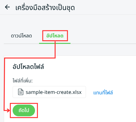 ขั้นตอนที่ 5: กลับไปที่หน้า เครื่องมือสร้างเป็นชุด > ไปที่แท็บ อัปโหลด > อัปโหลดไฟล์ Excel > ถัดไป
