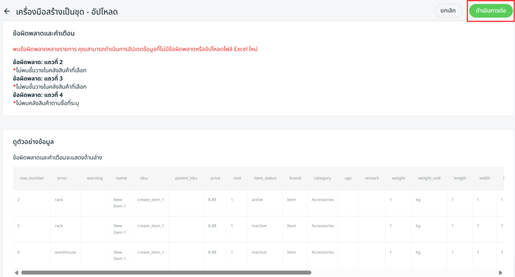 ขั้นตอนที่ 6: หากไฟล์ Excel ที่อัปโหลดมีข้อผิดพลาด คุณจะเห็นข้อความแสดงข้อผิดพลาดในส่วน ข้อผิดพลาดและคำเตือน และระบบจะแสดงคอลัมน์ที่มีข้อผิดพลาดใน แสดงตัวอย่างข้อมูล ให้ทำการแก้ไขคอลัมน์ที่มีข้อผิดพลาดและอัปโหลดไฟล์ใหม่อีกครั้ง คลิก ดำเนินการต่อ หากไม่มีข้อผิดพลาดในไฟล์ที่อัปโหลด