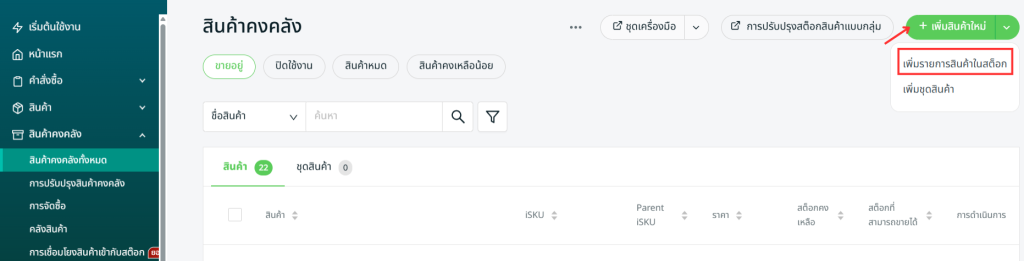 ขั้นตอนที่ 2: คลิกที่ + เพิ่มสินค้าใหม่ > เพิ่มรายการสินค้าในสต็อก
