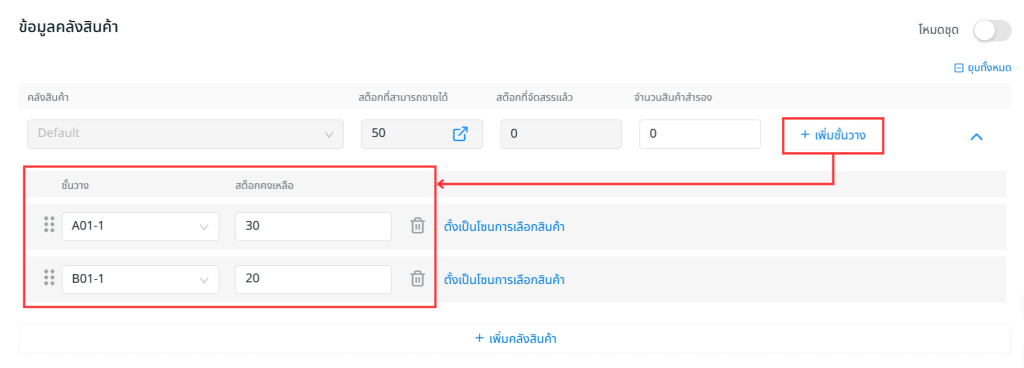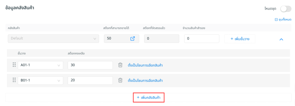 ขั้นตอนที่ 6: คลิก + คลังสินค้า (Add Warehouse) หากสินค้านั้นถูกจัดเก็บในหลายคลังสินค้า