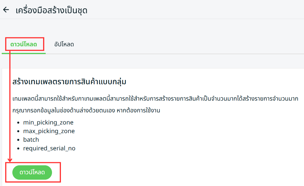 ขั้นตอนที่ 3: ที่แท็บ ดาวน์โหลด คลิกปุ่ม ดาวน์โหลดเพื่อดาวน์โหลดเทมเพลต Excel สำหรับสร้างรายการสินค้าเป็นชุด