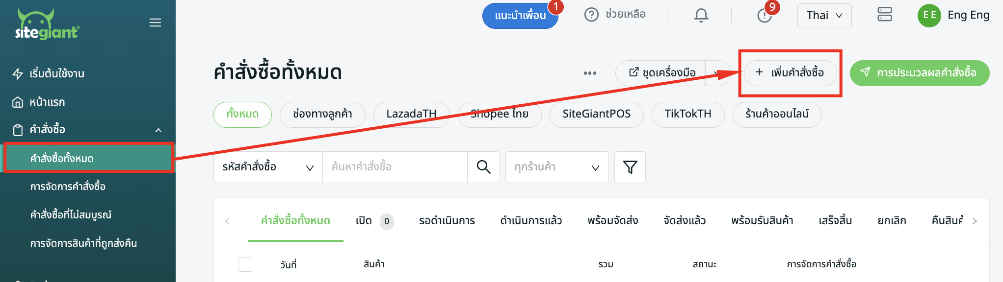 ขั้นตอนที่ 1: ไปที่ คำสั่งซื้อ > คำสั่งซื้อทั้งหมด > + เพิ่มคำสั่งซื้อ