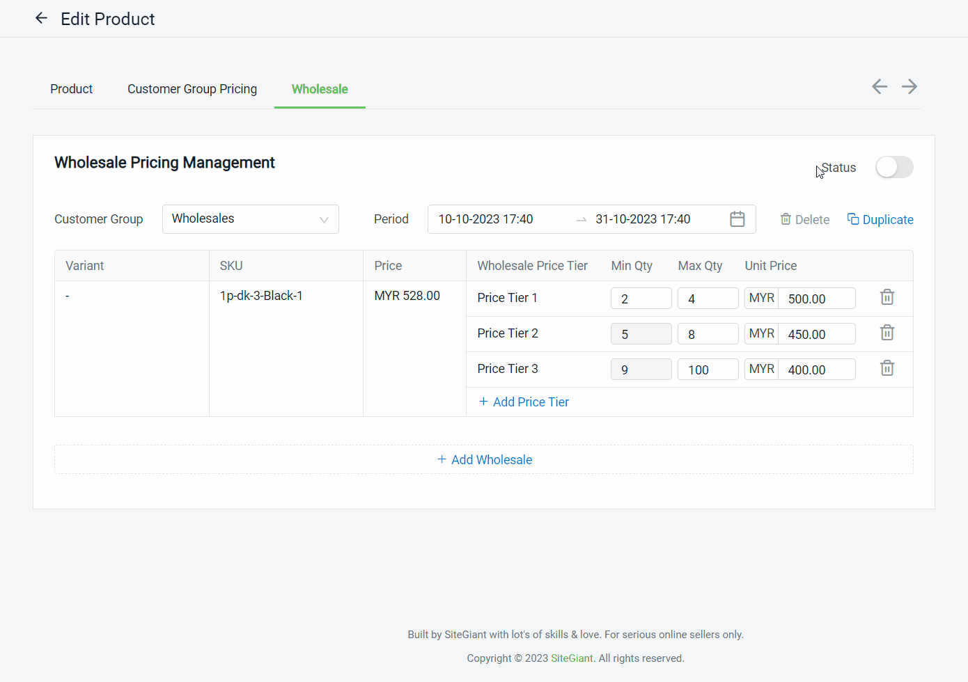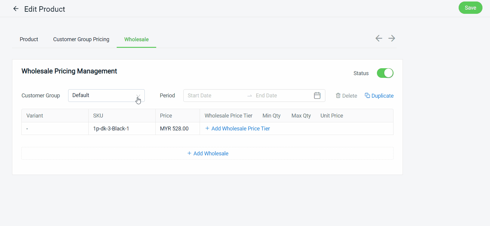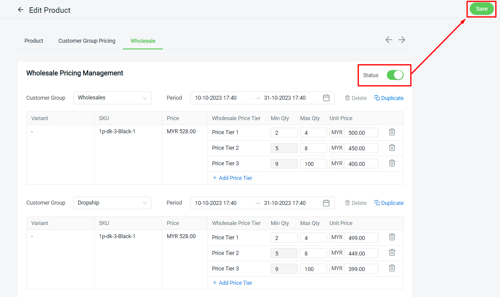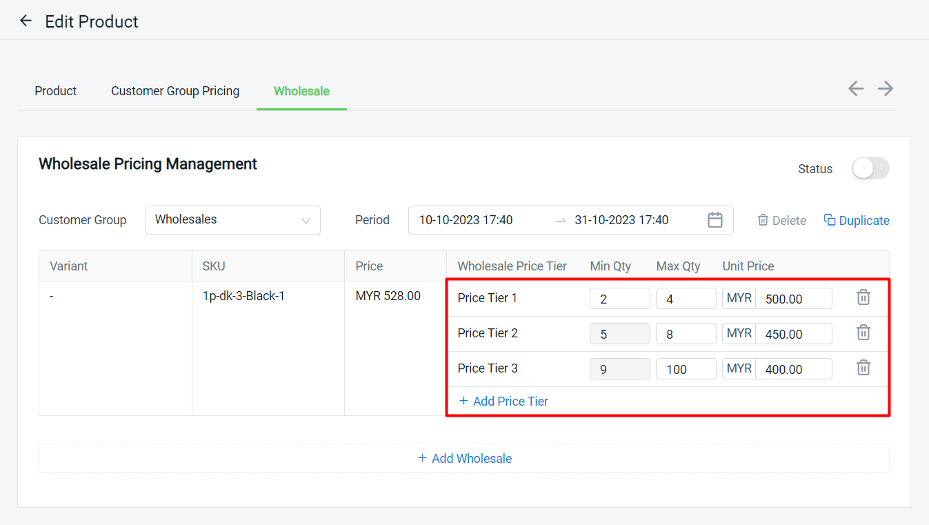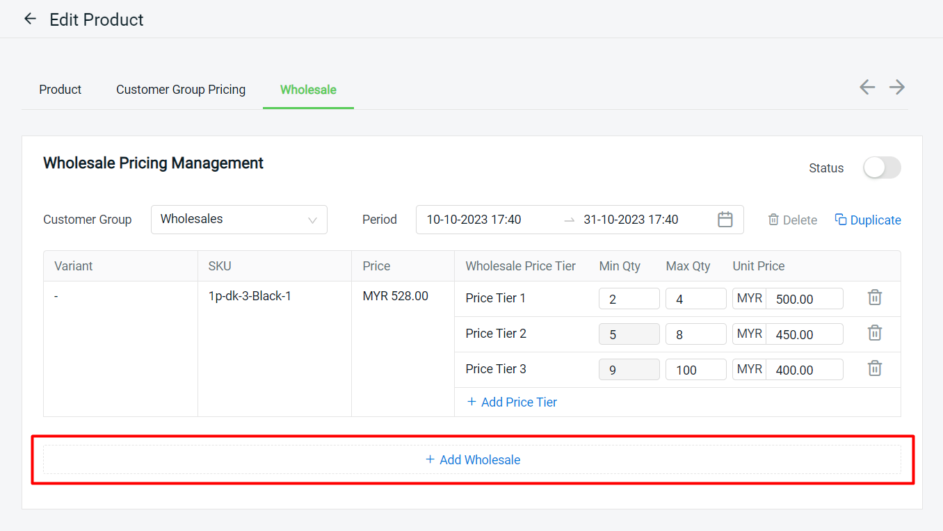 Step 5: If you wish to add more wholesale prices for different Customer Groups, you may click on the + Add Wholesale and repeat the steps above.