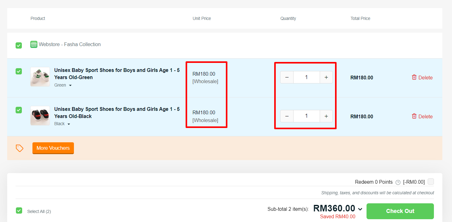 Step 2: If the customer selects a different variant within the same product, the quantity will be added together, and the wholesale discount will be applied based on the total quantity.