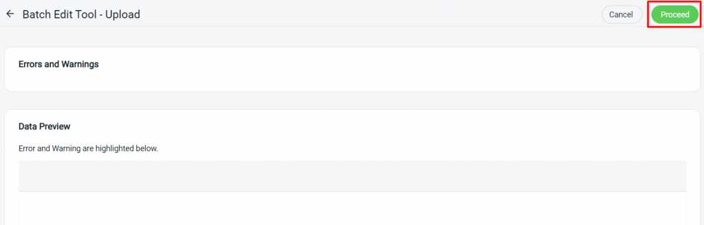 Step 7: If there are any errors in the Excel uploaded, you will see the error message in Errors and Warnings and it will show the error column in the Data Preview. Amend the error column and reupload the file. Click on Proceed if the file uploaded does not have errors.