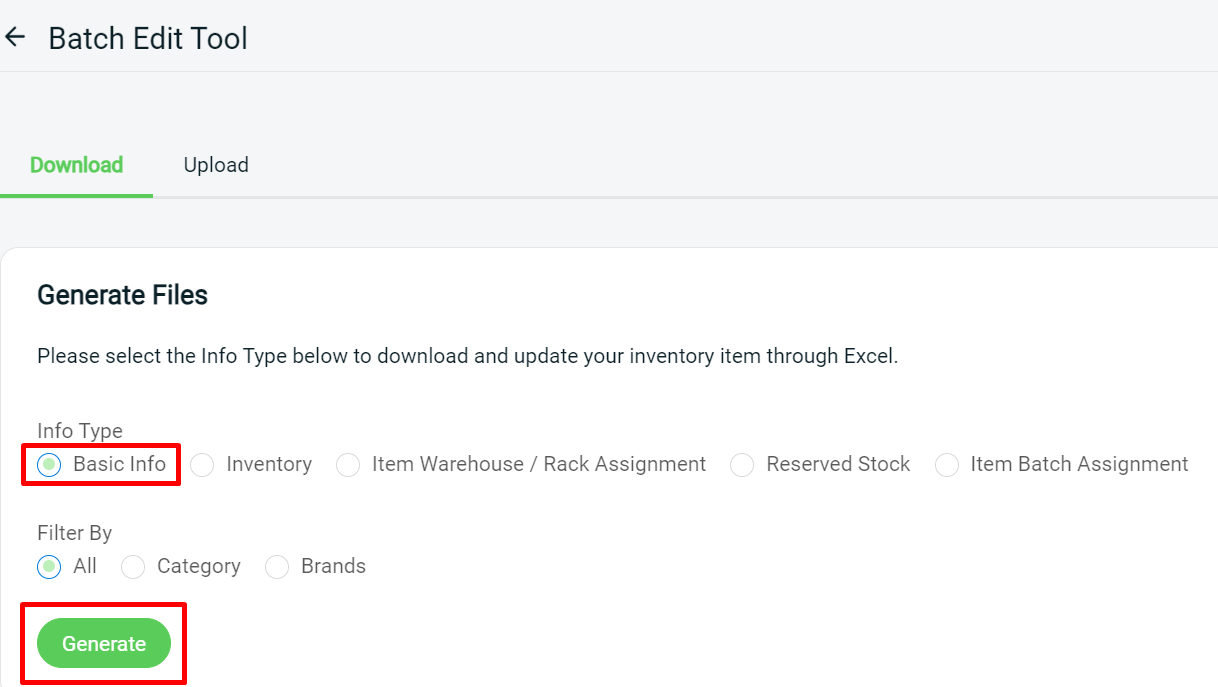 Step 3: Under download, select info type as Basic Info > you can choose to filter by category or brands > Generate.