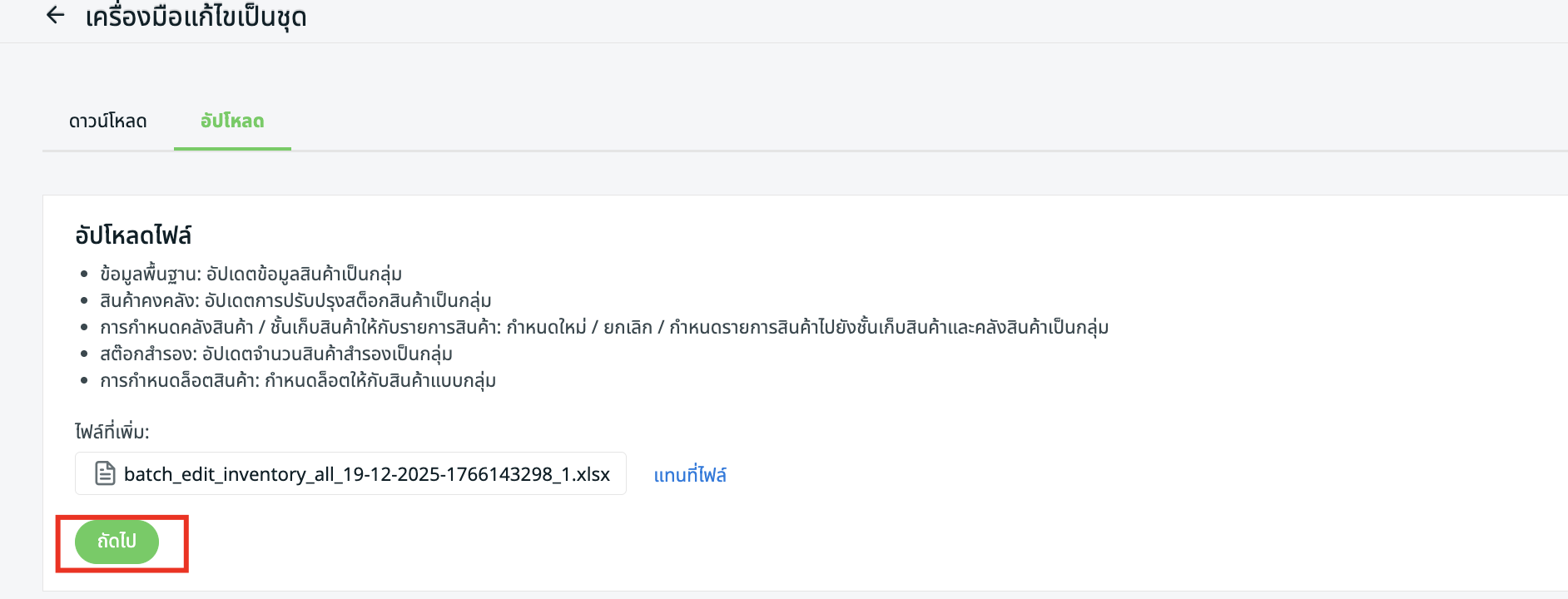 ฟีเจอร์นี้ช่วยให้คุณสามารถแก้ไขข้อมูลและรายละเอียดของสินค้าคงคลังแบบกลุ่มได้ โดยการอัปโหลดไฟล์ Excel ทำให้ไม่จำเป็นต้องแก้ไขสินค้าคงคลังทีละรายการ