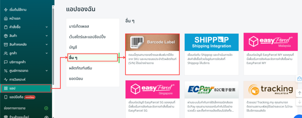 ขั้นตอนที่ 1: ไปที่ แอป จากเมนูแดชบอร์ด > อื่น ๆ > ป้ายบาร์โค้ด (Barcode Label)