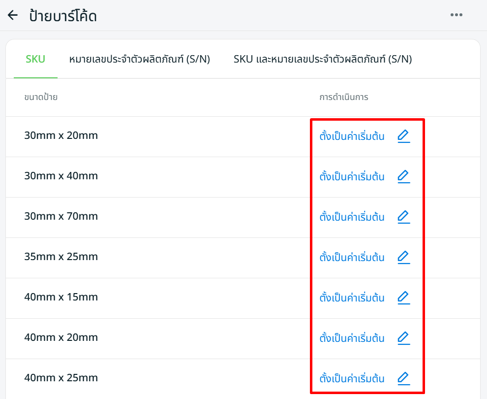 ขั้นตอนที่ 2: เลือกขนาดป้ายบาร์โค้ด (Barcode Label Size) ที่ต้องการ และคลิก ตั้งเป็นค่าเริ่มต้น (Set As Default) > คลิกไอคอน แก้ไข (Edit) เพื่อกำหนดค่าป้ายบาร์โค้ด