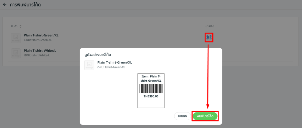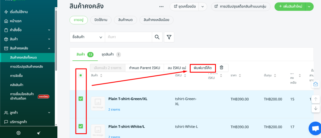 ขั้นตอนที่ 2: เลือกรายการสินค้าที่ต้องการพิมพ์ป้ายบาร์โค้ด > คลิก พิมพ์ป้ายบาร์โค้ด