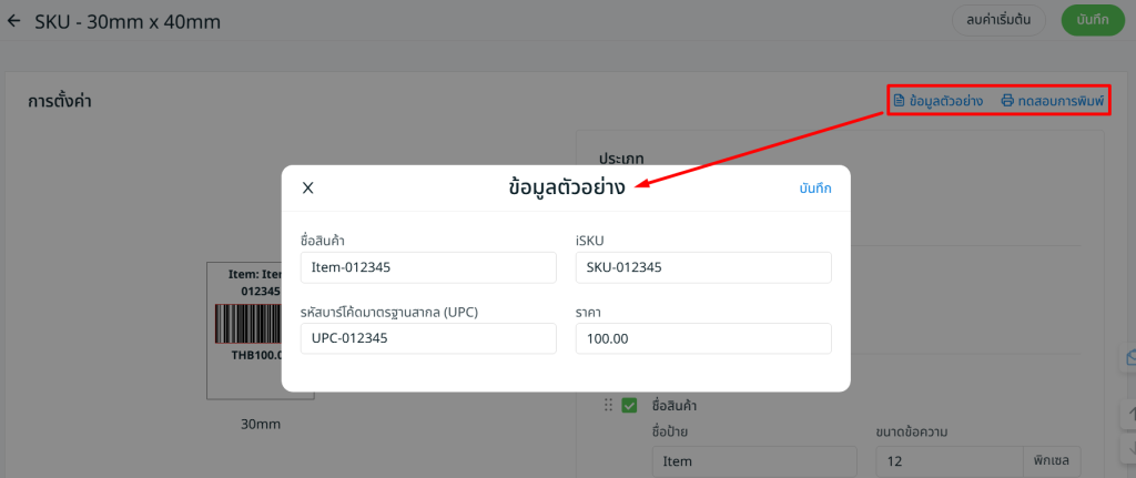 1. หากต้องการสร้างและพิมพ์ป้ายบาร์โค้ด (Barcode Label) สำหรับข้อมูลกำหนดเอง หรือสินค้าที่ไม่มีในระบบสินค้าคงคลัง สามารถตั้งค่าข้อมูลตัวอย่าง (Sample Data) และใช้การพิมพ์ทดสอบ (Test Print) เพื่อพิมพ์ป้ายบาร์โค้ดได้