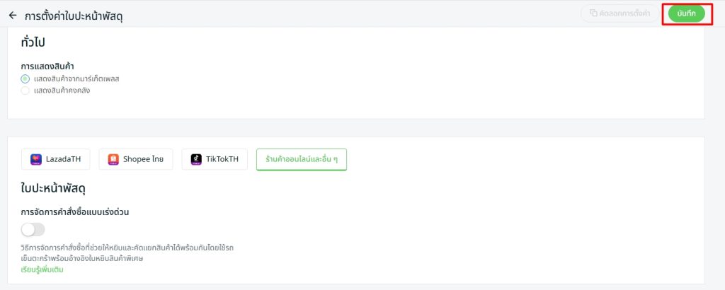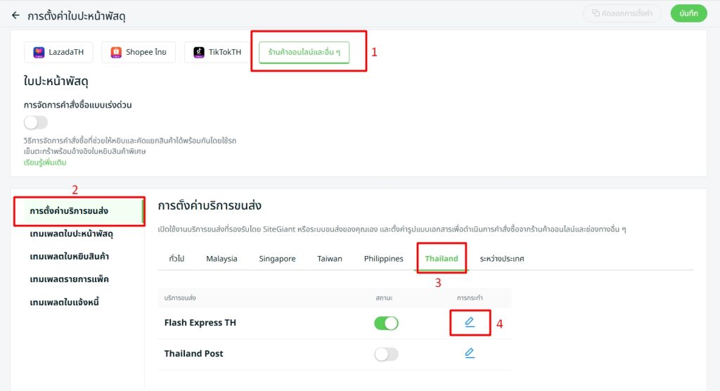 ขั้นตอนที่ 6 : คลิก บันทึก ที่มุมขวาบน เมื่อดำเนินการเสร็จสิ้น Flash Express TH จะถูกเชื่อมต่อกับ SiteGiant เรียบร้อยแล้ว