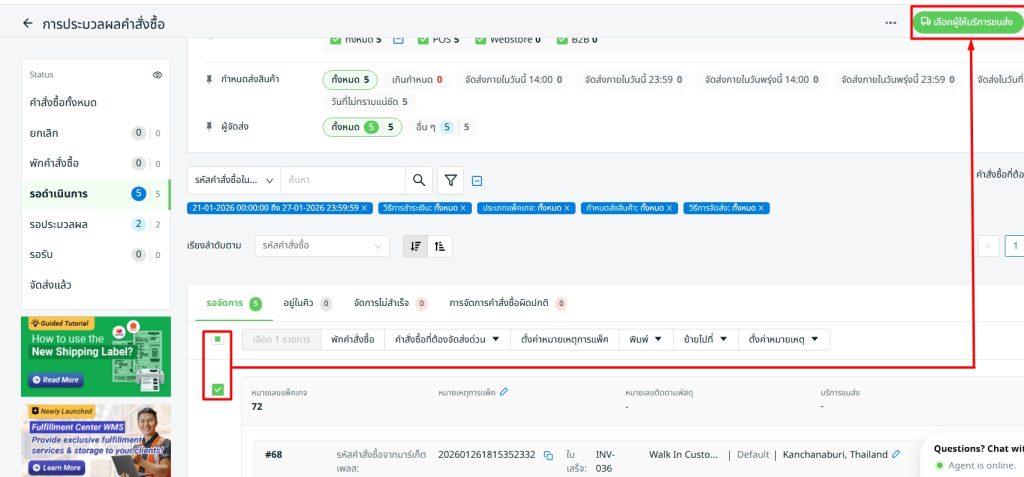 ขั้นตอนที่ 2: ไปที่แท็บ รอจัดการ > เลือกออเดอร์ที่ต้องการ > เลือกผู้ให้บริการขนส่ง