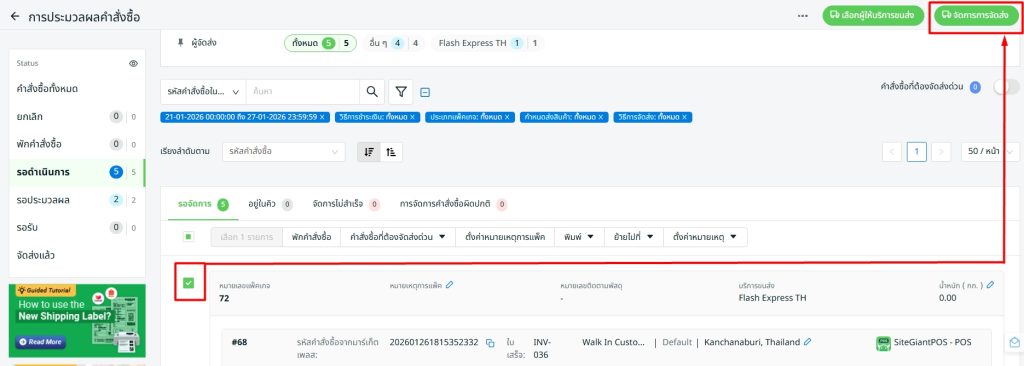 ขั้นตอนที่ 4: ติ๊กเลือกออเดอร์ > คลิก จัดการการจัดส่ง