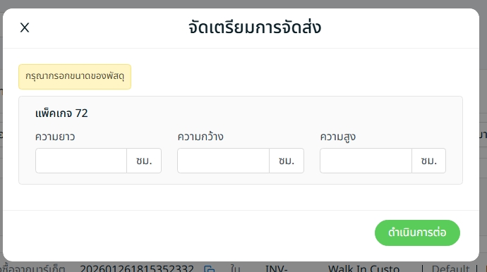 ขั้นตอนที่ 5: กรอกข้อมูลขนาดของพัสดุ > คลิก ดำเนินการต่อ