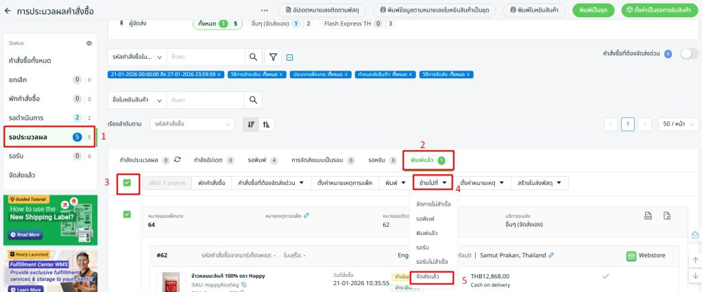ขั้นตอนที่ 3: ออเดอร์ที่พิมพ์แล้วจะถูกย้ายไปที่แท็บ พิมพ์แล้ว เมื่อส่งพัสดุเรียบร้อยแล้ว สามารถย้ายออเดอร์ไปที่สถานะ จัดส่งแล้ว ได้
