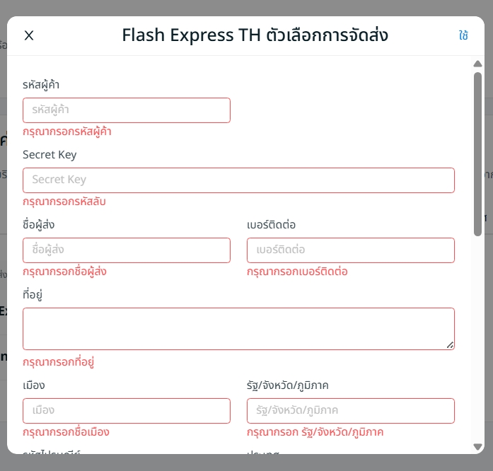 ขั้นตอนที่ 5: กรอกรายละเอียดการตั้งค่าการจัดส่ง Flash Express TH แล้วคลิก ใช้