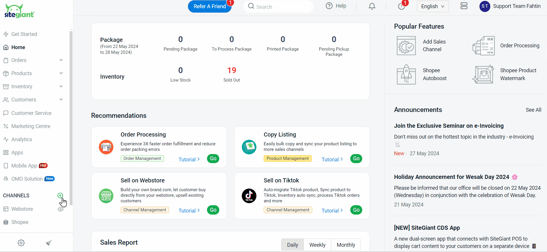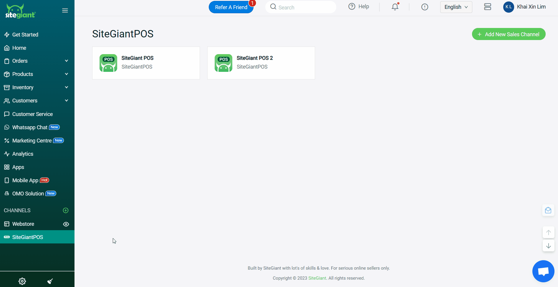 ขั้นตอนที่ 1: เข้าสู่ระบบ SiteGiant Seller Center ของคุณ > เพิ่มช่องทางขาย [+] > เลือก SiteGiant POS