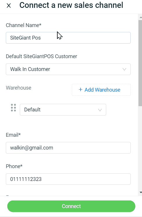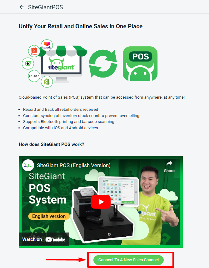 ขั้นตอนที่ 1: คลิกที่ช่องทางการขาย [+] บนเมนูด้านข้าง > เลือก SiteGiant POS > กรอกรายละเอียดของช่องทางขาย > เชื่อมต่อ