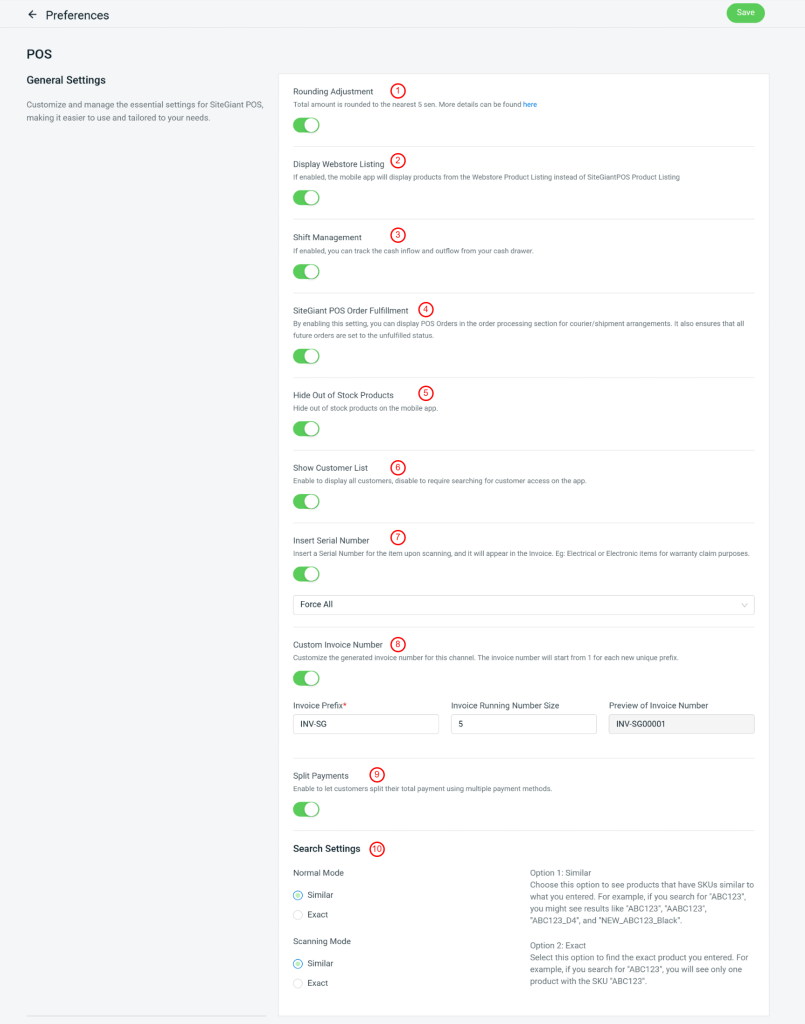 1. การปรับปัดเศษ: เปิดใช้งานเพื่อลดหรือปัดเศษทศนิยมของจำนวนเงินขึ้นหรือลงให้ใกล้ที่สุดที่ 5 เซ็นต์ 2. แสดงรายการสินค้า: เเปิดใช้งานเพื่อแสดงสินค้าจากรายการร้านค้าออนไลน์ (Webstore Listing) แทนการแสดงจาก SiteGiant POS Listing หากคุณต้องการใช้งานเครื่องมือการตลาดจาก Marketing Centre จำเป็นต้องใช้รายการร้านค้าออนไลน๋ (Webstore Listing) เท่านั้น 3. การจัดการกะ : เปิดใช้งานเพื่อรองรับการจัดการผู้ใช้งานหลายคน และติดตามกิจกรรมด้านกระแสเงินสดที่พนักงานของคุณดำเนินการระหว่างกะการทำงาน ดูเพิ่มเติมได้ที่ วิธีการตั้งค่าการจัดการกะ SiteGiant POS 4. การจัดการคำสั่งซื้อ SiteGiant POS: เปิดใช้งานเพื่อแสดงคำสั่งซื้อจาก POS ในส่วนการประมวลผลคำสั่งซื้อ เพื่อจัดเตรียมการจัดส่ง 5. ซ่อนสินค้าที่หมดสต็อก: เปิดใช้งานเพื่อซ่อนสินค้าที่ถูกตั้งสถานะสินค้าหมด (Out of Stock) ไว้ในรายละเอียดการเติมสต็อกสินค้า (Inventory Restock Details) 6. แสดงรายชื่อลูกค้า: เมื่อเปิดใช้งาน ปุ่มจะแสดงรายชื่อลูกค้าทั้งหมด หากปิดใช้งาน ข้อมูลลูกค้าของคุณจะถูกซ่อน คุณต้องค้นหาข้อมูลลูกค้าโดยใช้ หมายเลขติดต่อ, Member ID หรือ ชื่อ/อีเมล/หมายเลขติดต่อ 7. เพิ่มหมายเลขประจำตัวผลิตภัณฑ์ (S/N): คุณสามารถกรอกหมายเลขซีเรียลของสินค้าได้ขณะทำการสั่งซื้อ โดยมีตัวเลือกให้ตั้งค่าได้ 3 แบบ ได้แก่: I) ค่าเริ่มต้น (สามารถข้ามสินค้าใด ๆ ได้): ไม่จำเป็นต้องกรอกหมายเลขซีเรียลเมื่อทำการสั่งซื้อ II) ตัวเลือก (ตามการตั้งค่าสินค้า): คุณต้องกรอกหมายเลขซีเรียลสำหรับสินค้าที่มีการเปิดใช้งานตัวเลือกหมายเลขซีเรียลไว้ในการตั้งค่ารายการสินค้า หากไม่ได้อัปเดตหมายเลขซีเรียล จะไม่สามารถทำการสั่งซื้อได้ III) บังคับทั้งหมด: สินค้าทุกชิ้นต้องมีการอัปเดตหมายเลขซีเรียลก่อนทำการสั่งซื้อ 8. เลขที่ใบแจ้งหนี้แบบกำหนดเอง: ปรับแต่งหมายเลขใบแจ้งหนี้ของ SiteGiant POS ได้ตามต้องการ โดยสามารถกำหนด Invoice Prefix, ขนาดตัวเลขรันนิ่ง (Invoice Running Number Size) และ หมายเลขรันนิ่งถัดไป (Next Invoice Running Number) ได้ตามความต้องการของคุณ 9. การแบ่งชำระ (Split Payments): เปิดใช้งานปุ่มนี้เพื่อให้ลูกค้าสามารถใช้วิธีการชำระเงินหลายแบบในธุรกรรมเดียว ช่วยให้การชำระเงินสะดวกและราบรื่นมากยิ่งขึ้น ดูเพิ่มเติมที่ วิธีการใช้งานการแบ่งชำระของ SiteGiant POS 10. การตั้งค่าการค้นหา: ตั้งค่าพฤติกรรมการค้นหาสำหรับโหมดการค้นหาปกติ และโหมดการสแกน