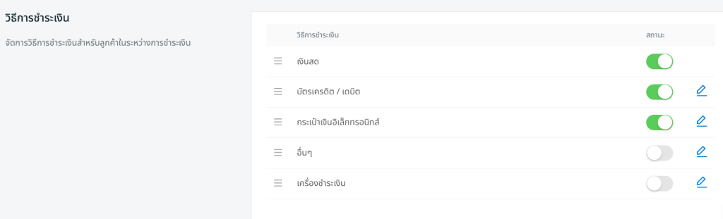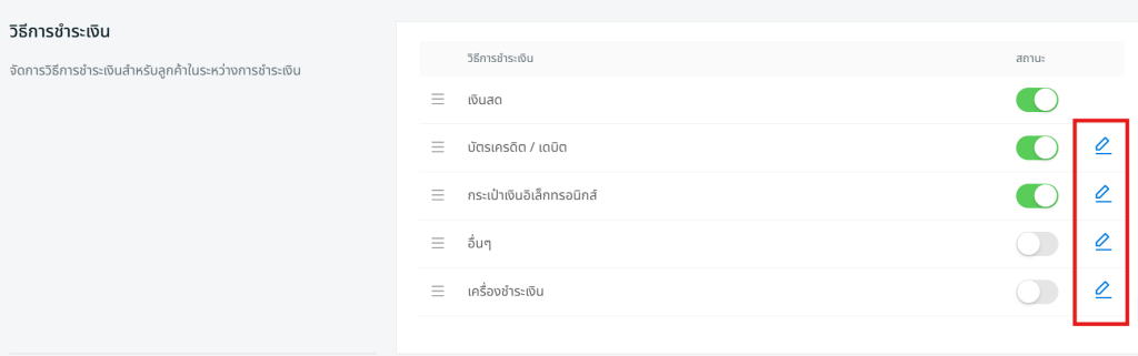 ขั้นตอนที่ 1: โดยค่าเริ่มต้นจะเปิดใช้งานเฉพาะเงินสด (Cash) สำหรับวิธีการชำระเงิน คลิกที่ไอคอนแก้ไข (Edit) เพื่อเพิ่มวิธีการชำระเงินสำหรับ บัตรเครดิต/เดบิต, E-wallet หรือวิธีการอื่น ๆ
