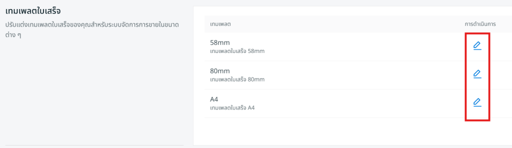 ขั้นตอนที่ 1: เลือกขนาดใบเสร็จสำหรับระบบ POS ของคุณ และคลิกที่ไอคอนแก้ไข