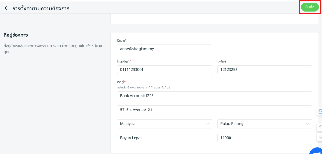 ขั้นตอนที่ 1: ข้อมูลการติดต่อของคุณสำหรับระบบ POS ที่แสดงในส่วนนี้ จะปรากฏบนใบแจ้งหนี้ของคุณ