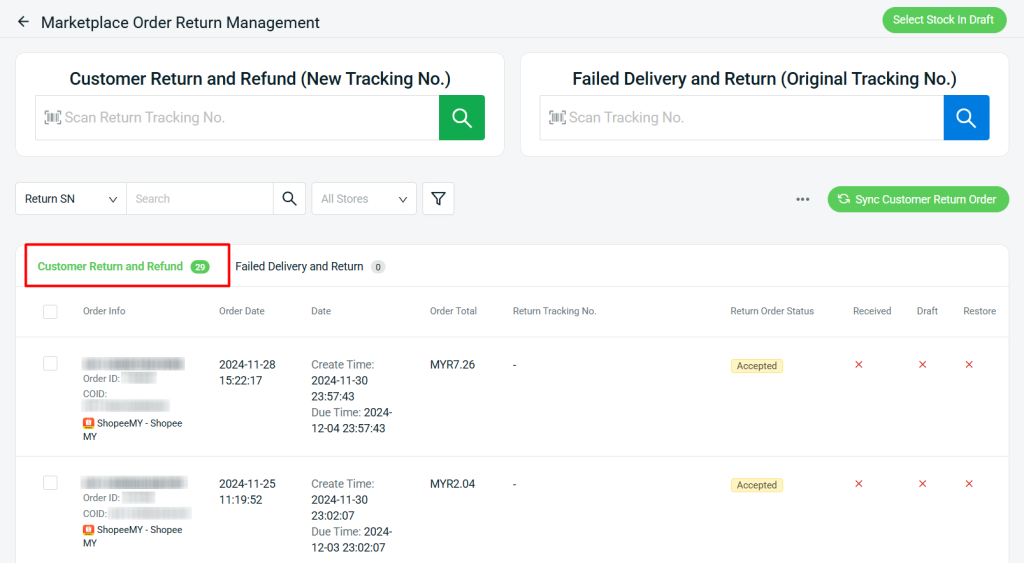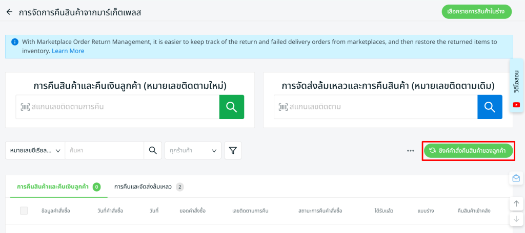 ขั้นตอนที่ 1: คลิก ซิงก์คำสั่งคืนสินค้าของลูกค้า เพื่อดึงออเดอร์คืนสินค้าจากมาร์เก็ตเพลสตามวันที่เลือก