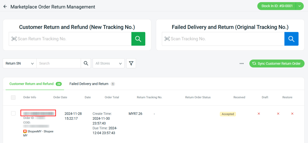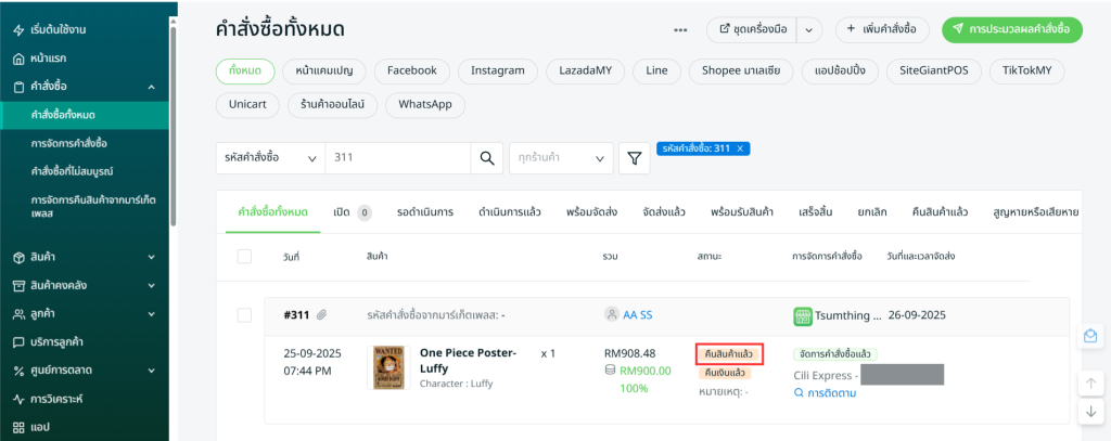 สำหรับมาร์เก็ตเพลสบางแพลตฟอร์ม เมื่อออเดอร์ถูกจัดส่งและเสร็จสิ้นแล้ว สถานะออเดอร์จะถูกอัปเดตเป็น เสร็จสมบูรณ์ ซึ่งจะเป็นสถานะสุดท้ายของออเดอร์นั้น แต่เมื่อมีการส่งคืนสินค้า สถานะออเดอร์จะไม่ถูกอัปเดตอัตโนมัติ คุณจึงสามารถทำเครื่องหมายสถานะออเดอร์นั้นเป็น ถูกส่งคืน ได้ด้วยตนเอง