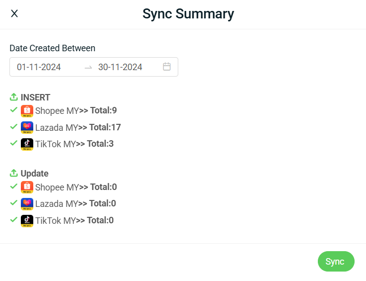 ขั้นตอนที่ 2: ตรวจสอบ สรุปรายการซิงก์ เพื่อดูจำนวนออเดอร์คืนสินค้าที่ถูกเพิ่มและอัปเดต
