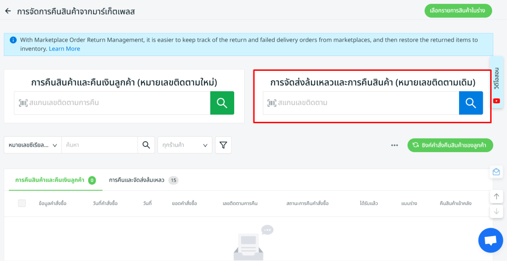 ขั้นตอนที่ 1: เมื่อพัสดุถูกส่งกลับมา ให้สแกนหรือกรอก เลขติดตามพัสดุเดิม ลงในช่อง ส่งไม่สำเร็จและถูกส่งคืน