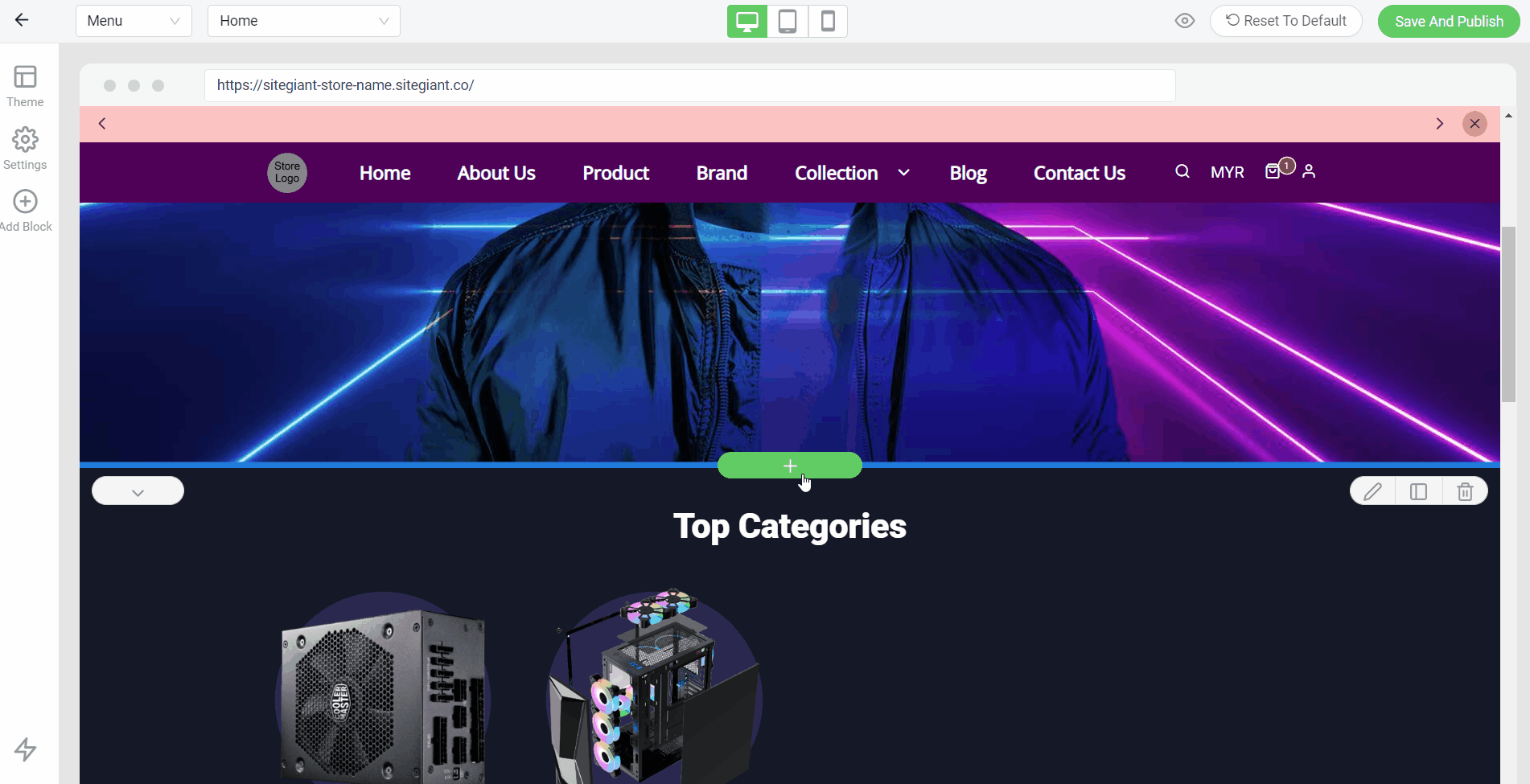 Step 2: Add a new block by clicking on the (+) button > click on Voucher > select the layout.