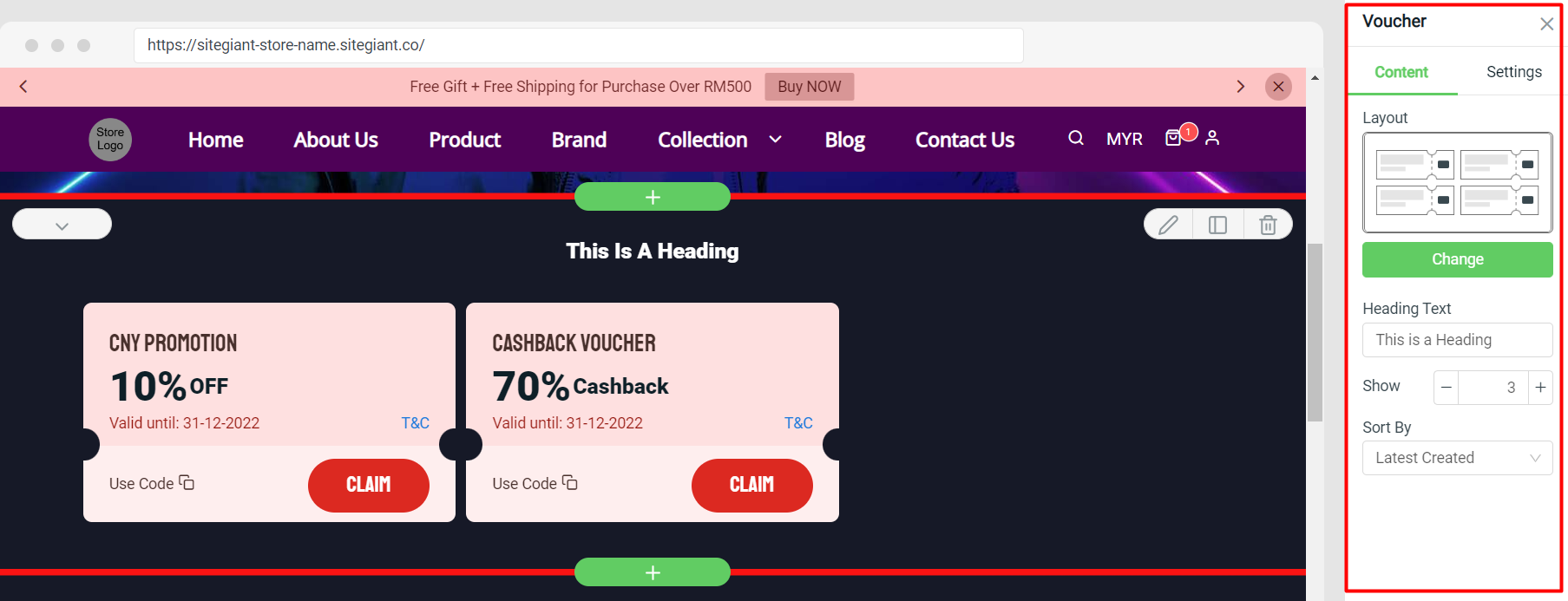 Step 1: If the availability is set as Public, the customers can see the Voucher from the Voucher Block you added in Webstore Builder. Login customers can Claim the voucher to their profile.