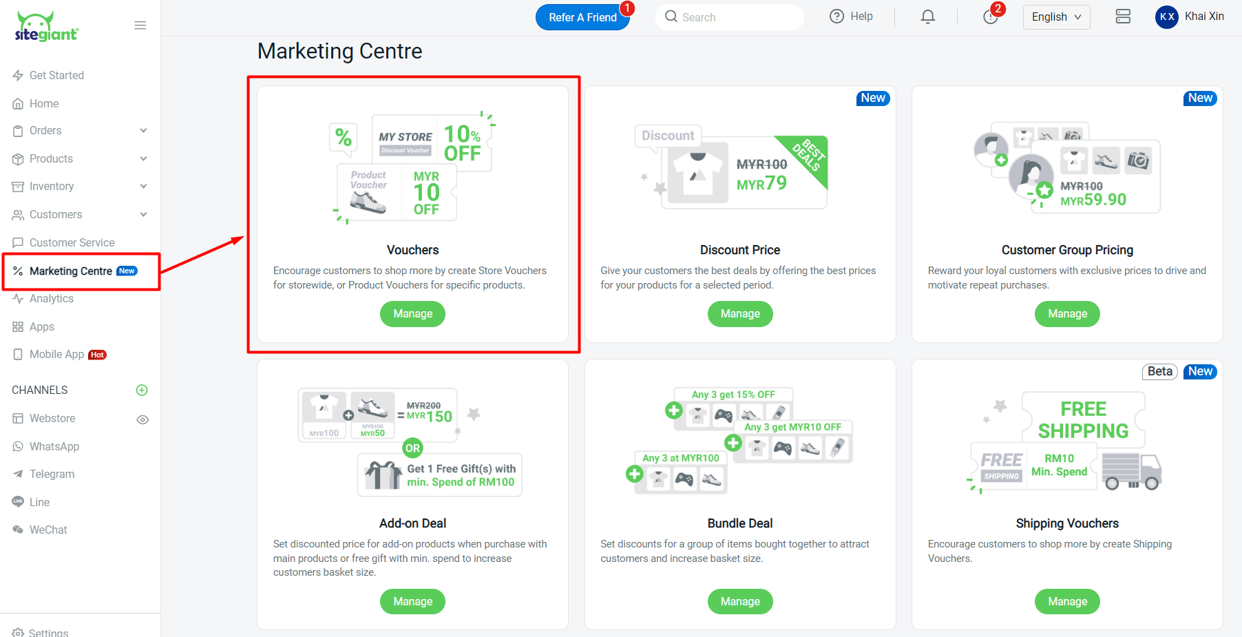 Step 1: Go to Marketing Centre on the sidebar menu > Vouchers.