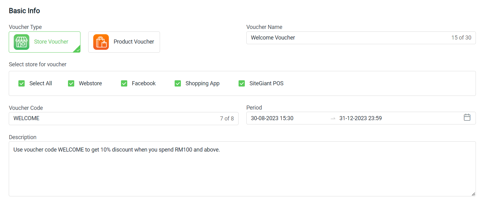 Step 4: Insert the Voucher Basic Info such as Voucher Name, Voucher Code, Period, and Voucher Description > select the applicable store for the voucher.
