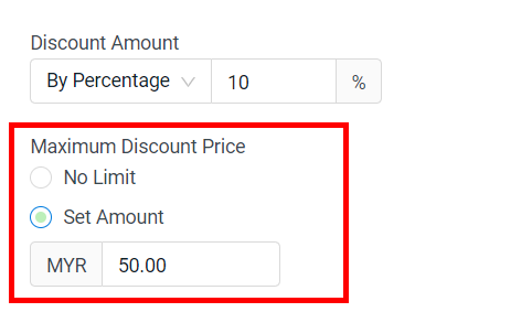 Step 6: If set the Discount Amount to By Percentage, the Maximum Discount Price can choose whether No Limit or Set Amount for a capped discount price.