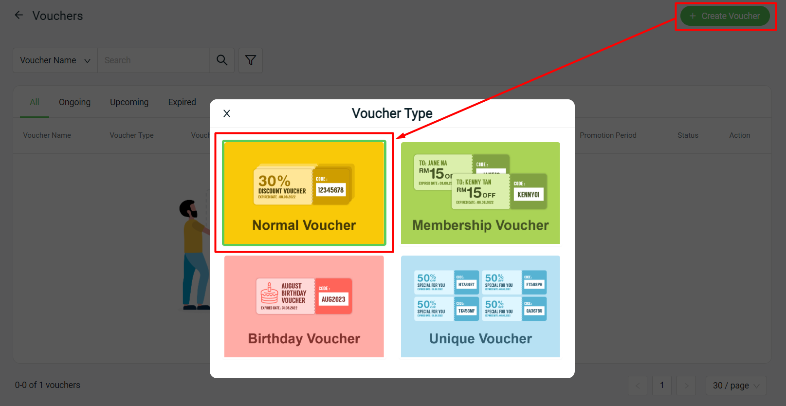 Step 2: Click on + Create Voucher > choose Normal Voucher.