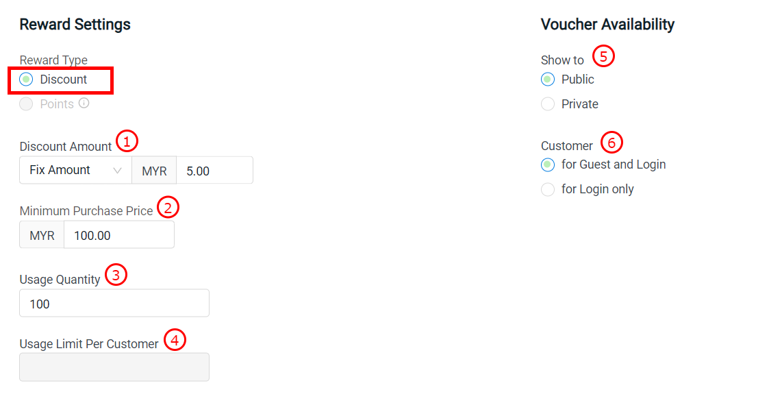 1. Discount Amount: Choose whether to offer the discount by Fix Amount or Percentage. 2. Minimum Purchase Price: The minimum purchase amount needed to be reached in order to use the voucher. 3. Usage Quantity: The number of times a voucher can be used. Insert 99999 for unlimited use. 4. Usage Limit Per Customer: The number of this voucher that can be used per customer account. 5. Show to: Choose Public if you wish to publish the voucher to all customers. Choose Private if you wish to share the voucher code with specific customers only. 6. Customer: Set whether only login customers are able to use the voucher or can be used by anyone including Guest Checkout.