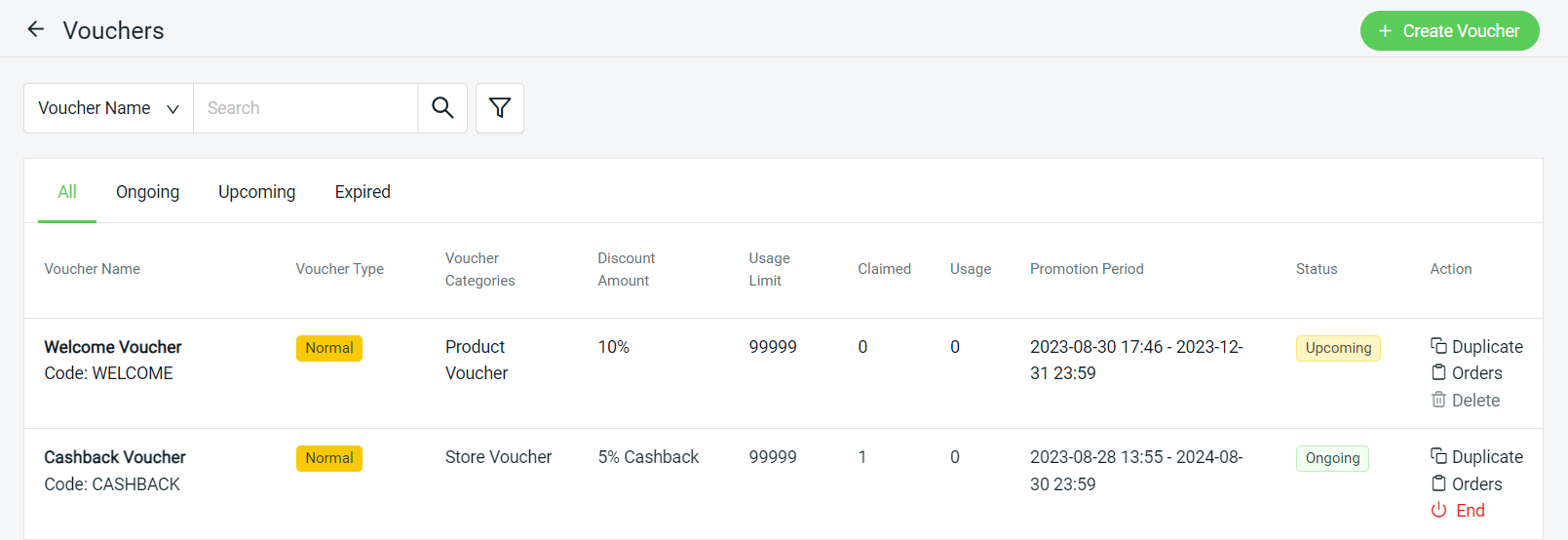 Step 9: Click on Create on the top right once done settings > the voucher created can be found on the Voucher Page.