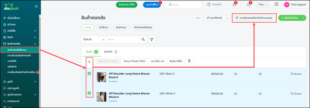 ขั้นตอนที่ 1: ไปที่เมนู สินค้าคงคลัง > รายการสินค้าคงคลังทั้งหมด > เลือกรายการสินค้าคงคลังที่คุณต้องการอัปเดตสต๊อก > ปรับสต็อกแบบกลุ่ม