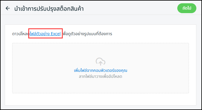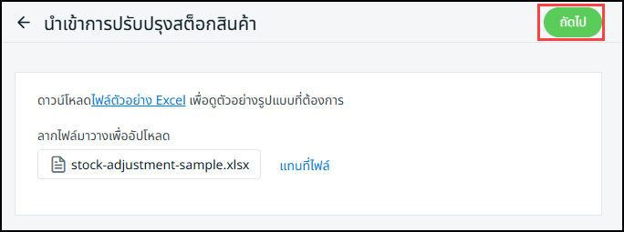 ขั้นตอนที่ 6: กลับไปที่หน้า นำเข้าการปรับปรุงสต๊อกสินค้า > อัปโหลดไฟล์ Excel > คลิก ถัดไป