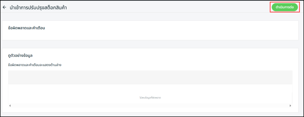 ขั้นตอนที่ 7: หากมีข้อผิดพลาดในไฟล์ Excel ที่อัปโหลด ระบบจะแสดงข้อความใน ข้อผิดพลาดและคำเตือน พร้อมเน้นคอลัมน์ที่ผิดใน ตัวอย่างข้อมูล ให้แก้ไขคอลัมน์ที่มีข้อผิดพลาดแล้วอัปโหลดใหม่อีกครั้ง หากไม่มีข้อผิดพลาดให้คลิก ดำเนินการต่อ