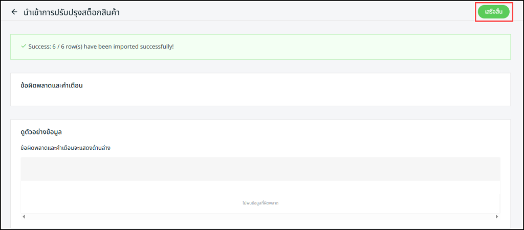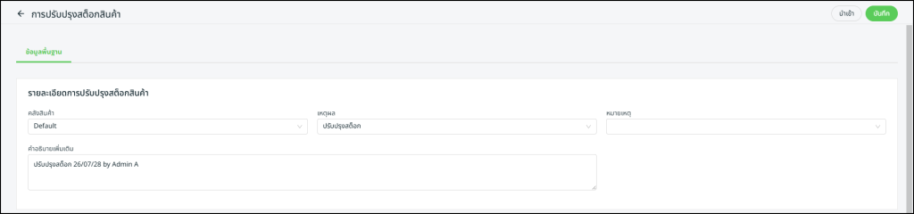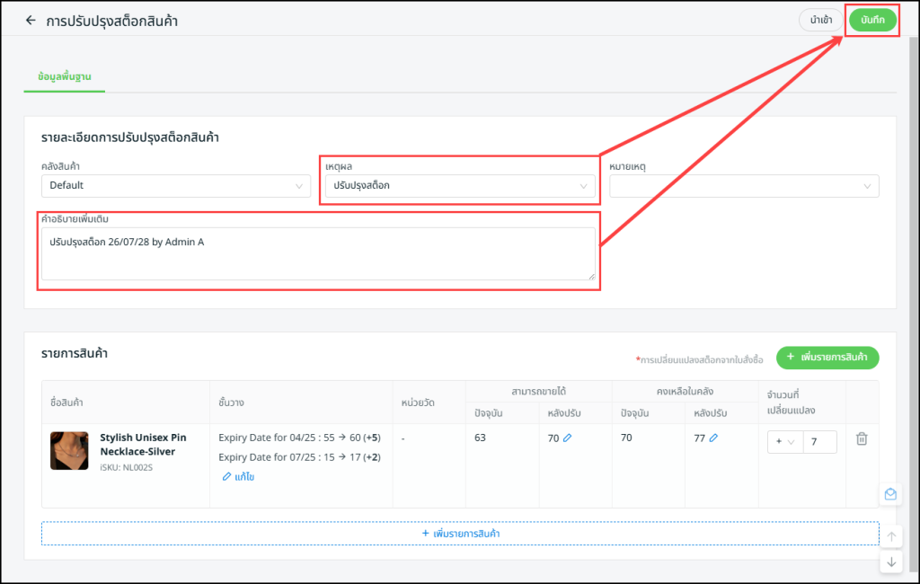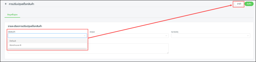 ขั้นตอนที่ 9: รายการสินค้าที่นำเข้าจะถูกเพิ่มเข้าไปในรายการสินค้า ดำเนินการกรอกรายละเอียดการปรับสต๊อก เช่น เหตุผล*, หมายเหตุ และบันทึกเพิ่มเติม > บันทึก