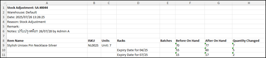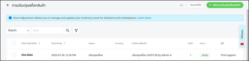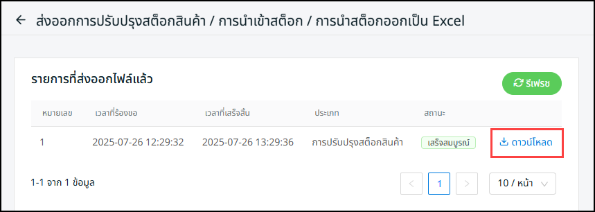 สามารถส่งออกและดาวน์โหลดไฟล์ Excel ของการปรับสต๊อกเพื่อใช้อ้างอิงในภายหลัง