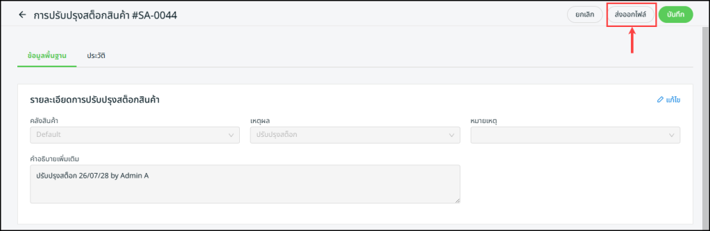 หลังจากบันทึกการปรับสต๊อก ระบบจะสร้าง รหัสการปรับสต๊อก ให้อัตโนมัติ